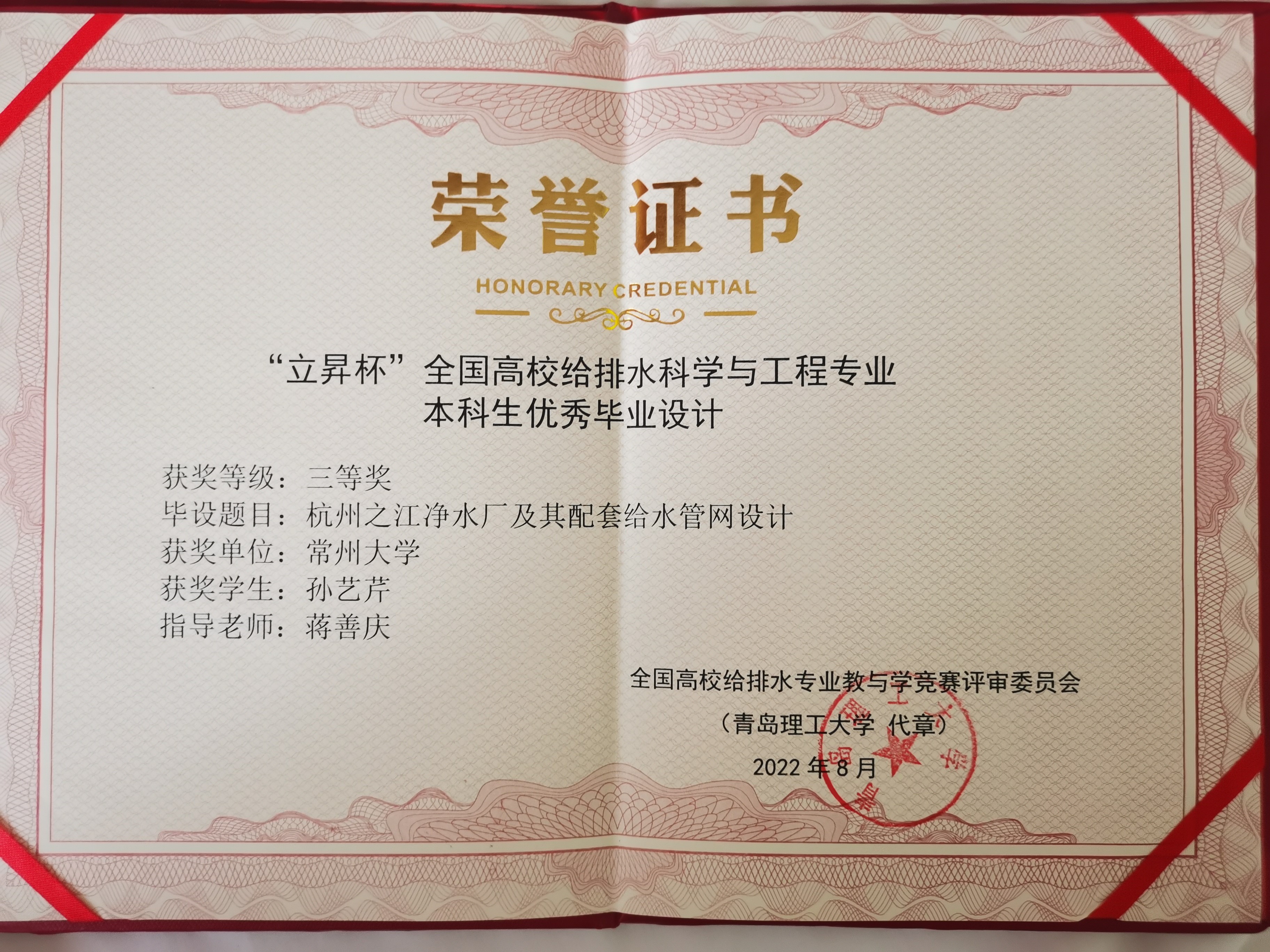 会上,我校吃瓜网 给排水科学与工程专业21级孙艺芹同学(指导教师:蒋善庆)的毕业设计“杭州之江净水厂及其配套给水官网设计”获得全国高校给排水科学与工程专业本科生优秀毕业设计(论文)三等奖。由王利平、蒋善庆、许霞等教师完成的作品“一体化净水集成技术装置”获得全国高校给排水科学与工程专业自制实验教学仪器设备与软件创新作品展示三等奖。展现了我校给排水科学与工程专业在创新型人才培养上所取得的优秀成果。
