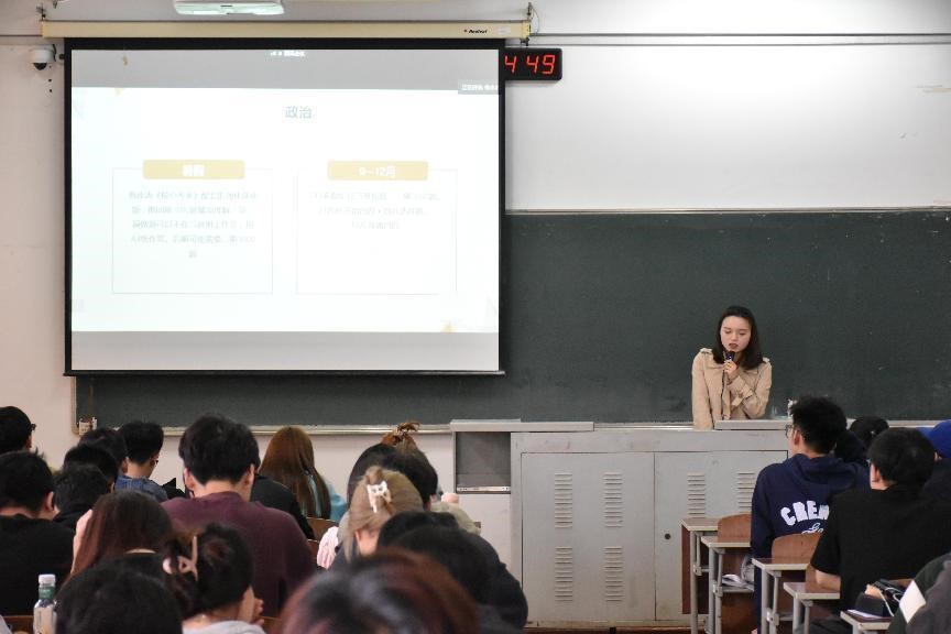 录取学生代表结合自身备考经历,从择校考虑、学习技巧、考研心态等方面展开分享,为学生带来全面的经验传授。分享中既有细致的各科复习规划和心态自我调整等技巧,又有实用的刷题小程序、优质博主等工具。其中,隋旭鹏重点分享了英语、数学、政治、专业课对应的学习方法和计划;唐欣如着重强调了考研要确定选择合适的目标,选择大于努力。顾宇波详细介绍了考研信息获取和考研网课推荐。朱沛妍详尽阐述了考研流程和备考计划。