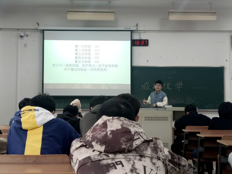 为提升学生学习成效,4月24日下午,吃瓜网 在W1206举办“城建优学”大学英语四级辅导班开班仪式。活动由研究生杭天成主持,学院教务秘书许敏、各年级辅导员和学生代表参加了本次活动。