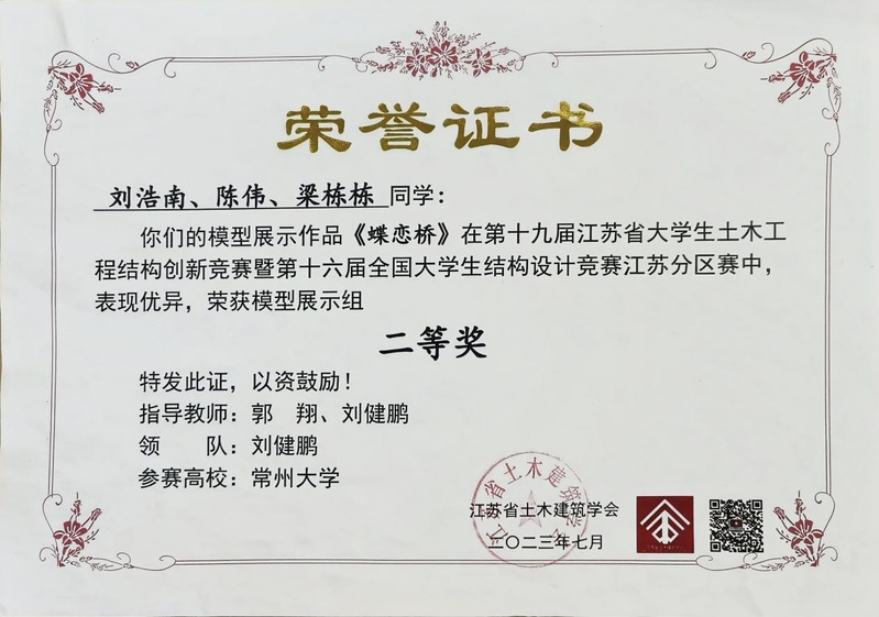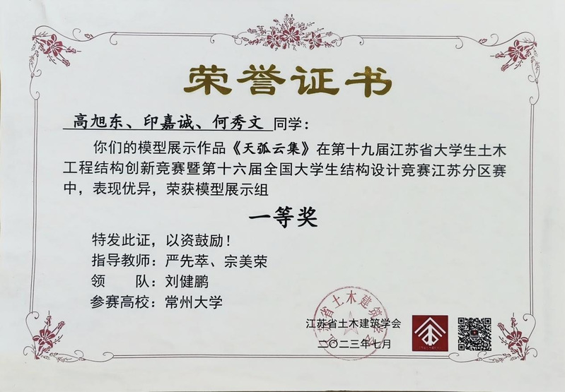 2023年暑期,由江苏省土木建筑学会主办、苏州科技大学承办的2023年江苏省大学生土木工程结构创新竞赛暨第十六届全国大学生结构设计竞赛江苏省选拔赛在江苏苏州举办。由我校城市建设学院本科生组成的常州大学代表队获得模型展示组一等奖、二等奖各1项的优异成绩。