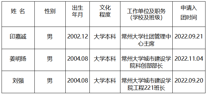 经征求团员群众意见、团支部集体研究,拟将印嘉诚等3名同学确定为入团积极分子,现予以公示。公示时间:2023年9月21日至2023年9月28日(5个工作日)。如公示对象存在问题,欢迎广大团员群众通过来电、来信、来访反映。以个人名义信函反映问题提倡署真实姓名。联系人:程成,联系电话:0519-86330218。