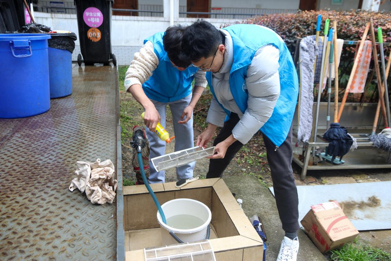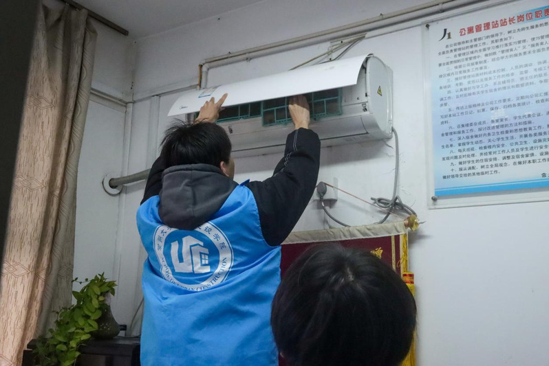志愿团成员们分成2队,进入楼栋进行清理活动。成员们分工合作,首先对空调外侧进行彻底擦洗随后取下满是污垢空调滤网,多次用清洁剂清洗干净,确认无误后装回确保空调可以安全运行。团队成员们相互支持,创造了一个清洁舒适的住宿楼,让暖意通过空调传递给每一个人。