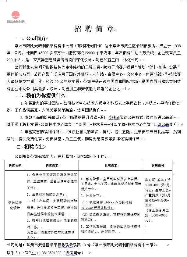 招聘[2024072]常州市阳凯光精制钢结构有限公司2024春季招聘简章