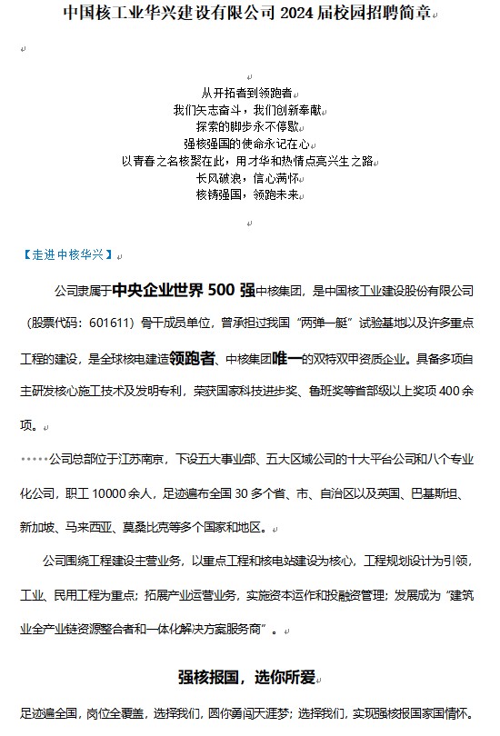 招聘[2024076]中国核工业华兴建设有限公司2024届校园招聘