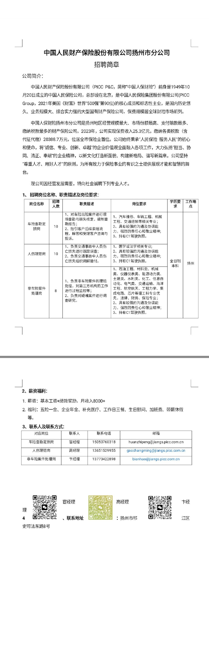 招聘[2024090]中国人民财产保险股份有限公司扬州市分公司2024校园招聘简章