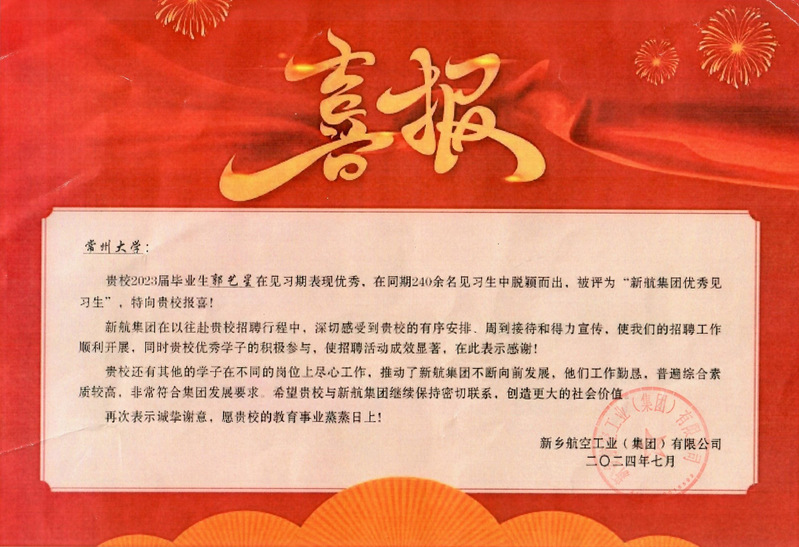 近日,航空工业新乡航空工业(集团)有限公司向学校发来喜报,吃瓜网 2023届毕业研究生郭艺星在见习期表现优秀,在同期240余名见习生中脱颖而出,被评为“新航集团优秀见习生”。