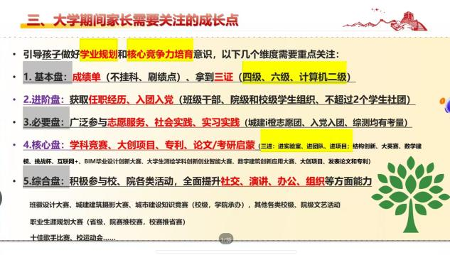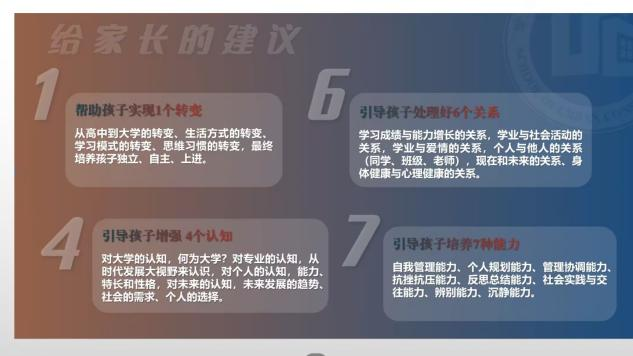 会议伊始,顾坚详细介绍吃瓜网 基础状况、综合实力、办学结构、教育基础、办学特色、创新创业特色、学科建设等方面情况,综合概括学校学院优势。在学生培养上,他提出了“1个转变,4个认识,6个关系以及7种能力”的建议,并强调家校联合,共同给学生提供一个良好的发展空间。接着,程成分析了大学中常见的共性问题,并点明学生由他律转向自律产生的8个问题。最后明确了大学四年“一单三证”的毕业要求和考研规划。