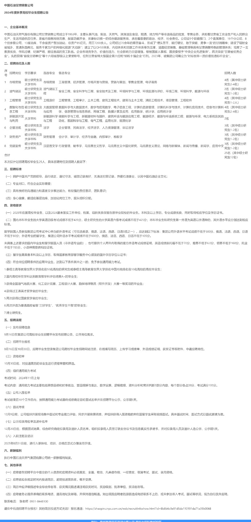 招聘[2024153]中国石油甘肃销售公司2024年度秋季高校毕业生招聘宣讲会