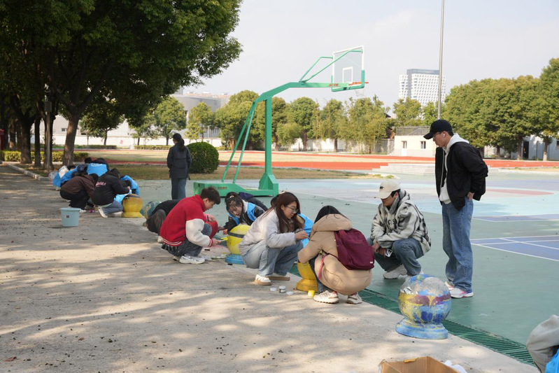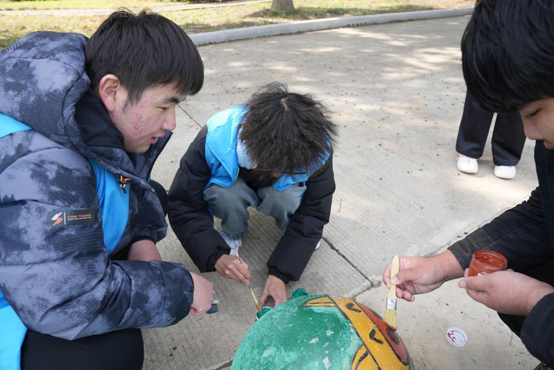 活动一经发起,便吸引了众多热心的学生志愿者踊跃参与。下午两点三十分他们带着满腔的热情和无限的创意,齐聚在特殊教育学院的校园内。在活动现场,学校老师介绍了“色彩传递关爱”这一主题,简要说明绘画区域分配、材料使用方法以及安全注意事项。随后,志愿者分成若干小组,每组负责一个石墩的绘画工作。志愿者们分别调色、勾勒、上色,经过三个小时的通力协作,普通的石墩被创作成了卡通形象、花卉图案和励志标语等多样化的艺术作品。这些绘画作品分布在校园的主要通道两侧,为校园环境增添了新的视觉元素。