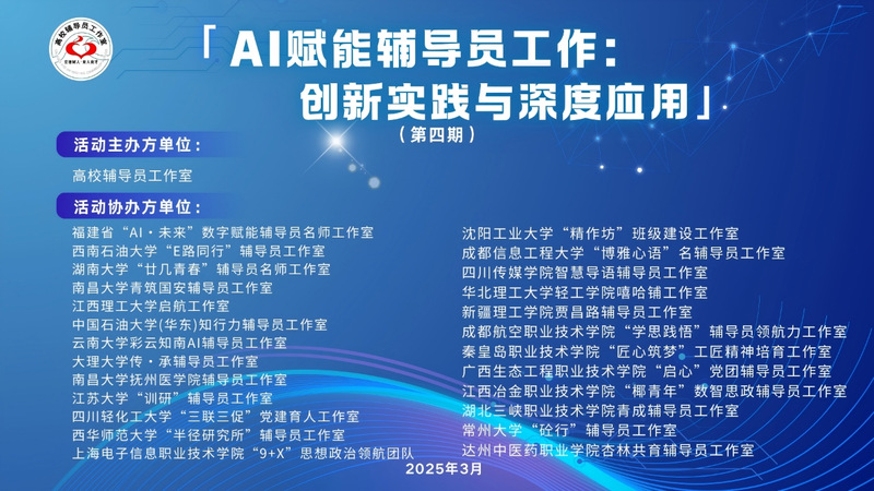 3月22日,由高校辅导员工作室牵头主办、砼行辅导员工作室等25家辅导员工作室联合协办的AI赋能辅导员工作(第三期)线上公益沙龙圆满落幕。本次活动聚焦AI+思政教育创新实践,通过数字化手段赋能高校思想政治教育工作高质量发展。