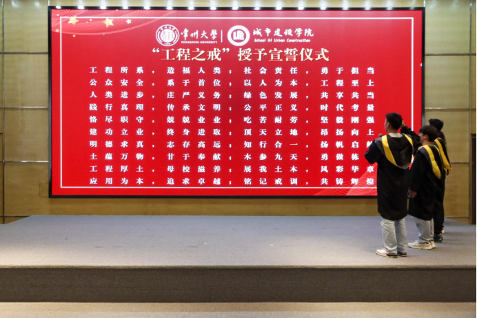 “工程之戒”授予宣誓仪式将典礼推向高潮。学院党委副书记顾坚为毕业生代表逐一颁发象征责任与使命的工程之戒,全体毕业生庄严宣誓,铮铮誓言响彻会场,彰显着城建学子的专业担当。