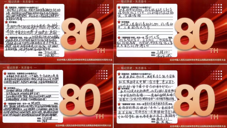 习近平总书记的重要讲话深刻阐释了抗日战争的历史意义和时代价值,强调要铭记历史、珍爱和平、开创未来。阅兵仪式正式开始。空中护旗梯队率先通过,党旗、国旗、军旗引领方向。26架直升机组成“80”字样,3架悬挂“正义必胜、和平必胜、人民必胜”标语,气势磅礴 。受阅装备方阵中,国产现役主战装备体系化亮相,新域新质力量与战略威慑力量的模块化呈现,空中梯队涵盖预警指挥、歼击、轰炸等多型主战机型,让在场师生直观感受到国防和军队现代化的历史性跨越。本次阅兵是推进中国式现代化新征程的首次阅兵,也是人民军队奋进建军百年的崭新亮相,宣示铭记历史、珍爱和平、捍卫胜利成果的坚定决心。观礼后,师生们拿起笔,在特制卡片上认真作答,从“回望历史”“和平寄语”到“强国有我”三个维度,抒发内心感悟。
