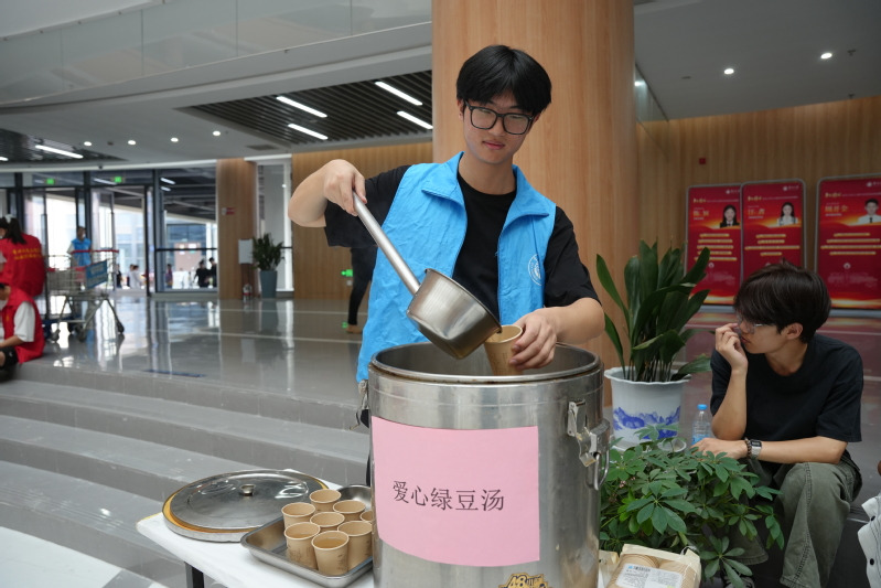 考虑到报到当日天气炎热,学院在报到点旁增设“清凉驿站”,志愿者们手捧盛满爱心绿豆汤的纸杯,为新生及家长驱散暑气。同时,学院90余位志愿者奔走于校园,提前抵达车站接驳新生,手提肩扛帮着搬运行李,耐心引导完成报到流程,从校园路线指引到宿舍床位整理,事无巨细。