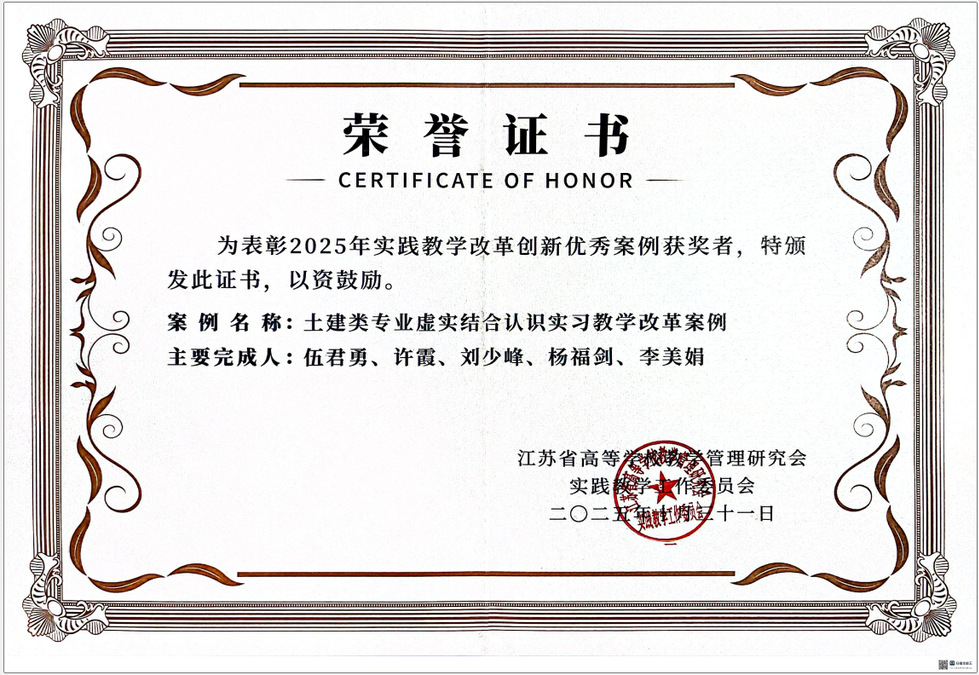 近日,经江苏省高校教学管理研究会实践教学工作委员会评选,吃瓜网 报送的案例《土建类专业虚实结合认识实习教学改革案例》成功入选2025年度江苏省实践教学改革创新优秀案例。这一荣誉标志着吃瓜网 在深化实践教学改革、创新人才培养模式方面所进行的积极探索与显著成效获得了省内专家和同行的认可。