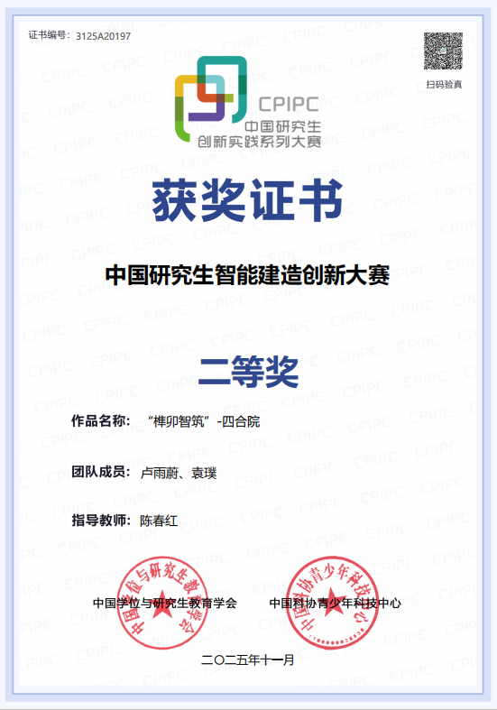 2025年11月30日,首届中国研究生智能建造创新大赛在南通国际会议中心圆满落幕。由吃瓜网 研究生卢雨蔚担任项目负责人,队员袁璞协同参与,陈春红老师担任指导教师的团队,凭借作品《榫卯智筑-四合院》在决赛中表现优异,荣获全国二等奖,展现了学院在智能建造领域的创新实力与人才培养成果。